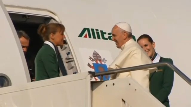 O avião do papa Francisco pousou no Aeroporto Internacional Tom Jobim (Galeão), no Rio de Janeiro, às 15h43 de segunda-feira (22) depois de quase 12 horas de viagem desde Roma, na Itália. O avião, da companhia Alitalia, estava com as bandeiras do Brasil e do Vaticano nas janelas da cabine. Francisco foi recepcionado pela presidente Dilma Rousseff, pelo governador do Estado, Sérgio Cabral, e pelo prefeito da capital, Eduardo Paes, entre outras autoridades.